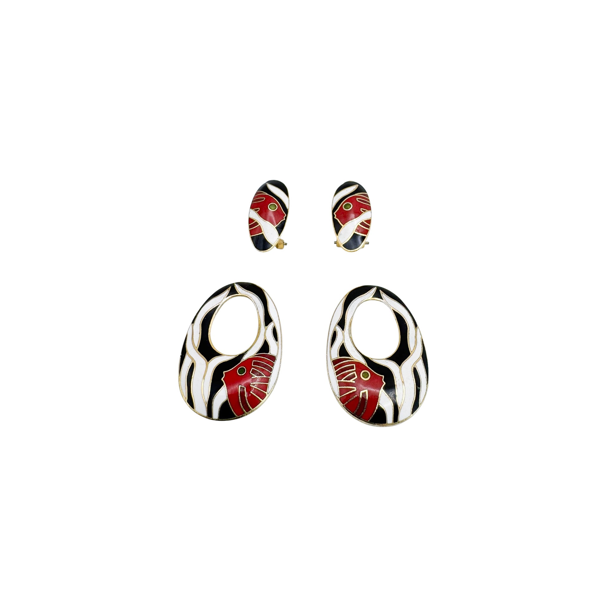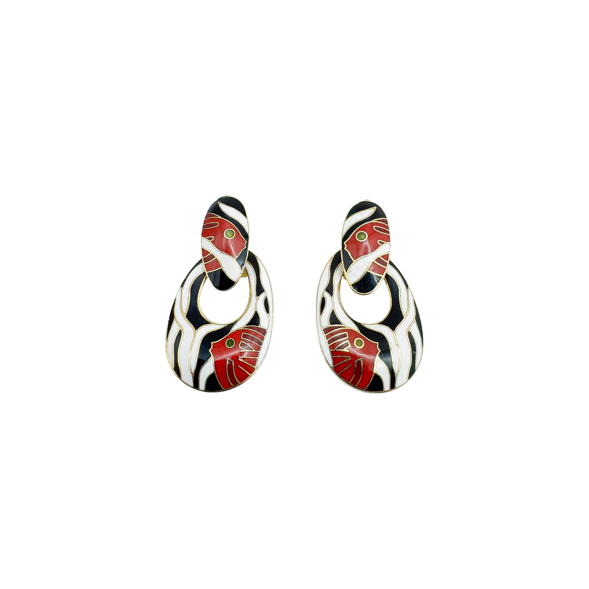 These enchanting vintage cloisonné earrings combine joy and artistic details. Each earring features two vibrant red fish gracefully swimming over a black and white background, crafted in a geometric dangling round shape. Perfect for adding a playful yet sophisticated touch to everyday outfits or solid-colored ensembles.