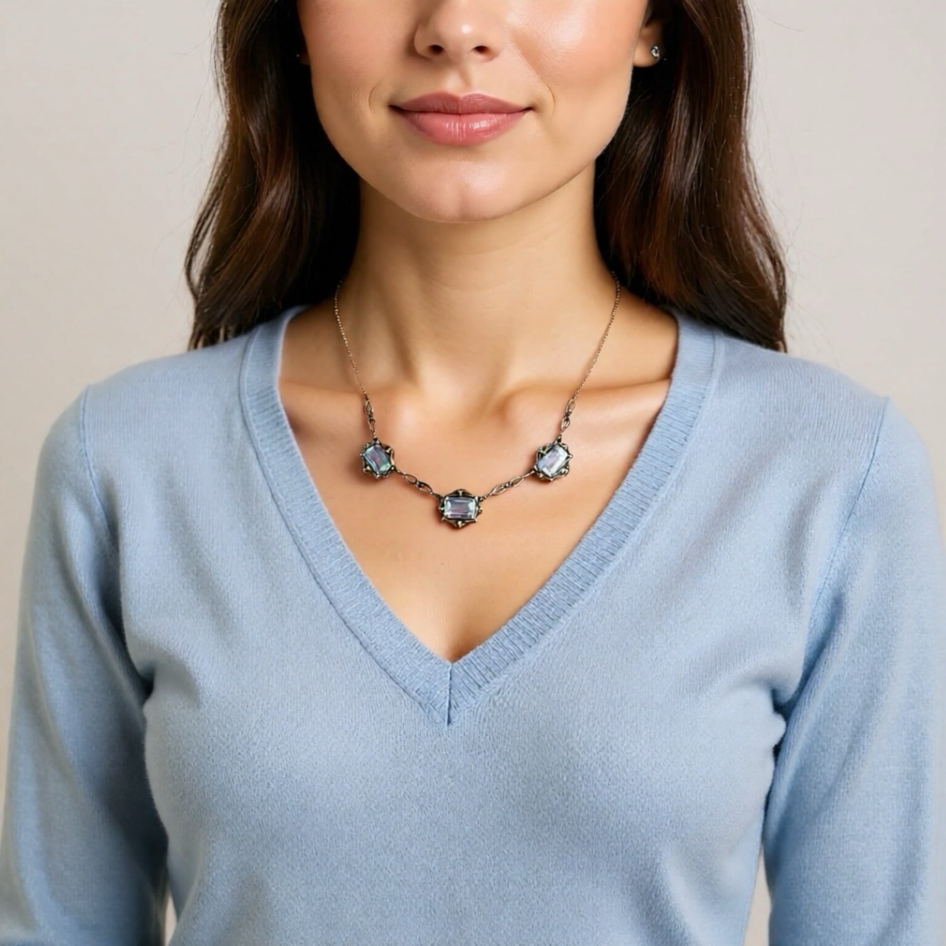 Zamansız bir zarafeti keşfedin: Antika Gümüş Iris Cam Art Deco Tarzı Kolye. Bu eşsiz tasarım, ışıkla buluştuğunda gökkuşağı tonlarında büyüleyici bir ışıltı yayan iris camı ile göz kamaştırır. Art Deco’nun zarif çizgileri ve geometrik estetiği ile bir araya gelen bu kolye, geçmişin büyüsünü modern stil anlayışıyla buluşturuyor. Günlük stilinize sofistike bir dokunuş katmak veya özel anlarınıza Art Deco’nun ikonik şıklığını taşımak için mükemmel bir seçim.