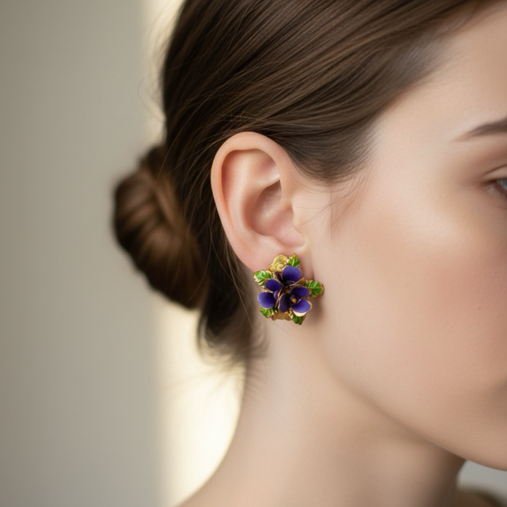 Bu zarif küpeler, Süfrajet hareketinin simgesi olan soğuk boyama mine işi menekşe tasarımına sahiptir. 20. yüzyılın başlarına ait bu küpe, hareketin renklerini içerir: sadakat için mor, umut için yeşil ve saflık için beyaz. Bu küpeler, dönemin ve güçlü sembolizminin güzel bir temsilidir ve onları tarihi bir mücevher parçası yapar.