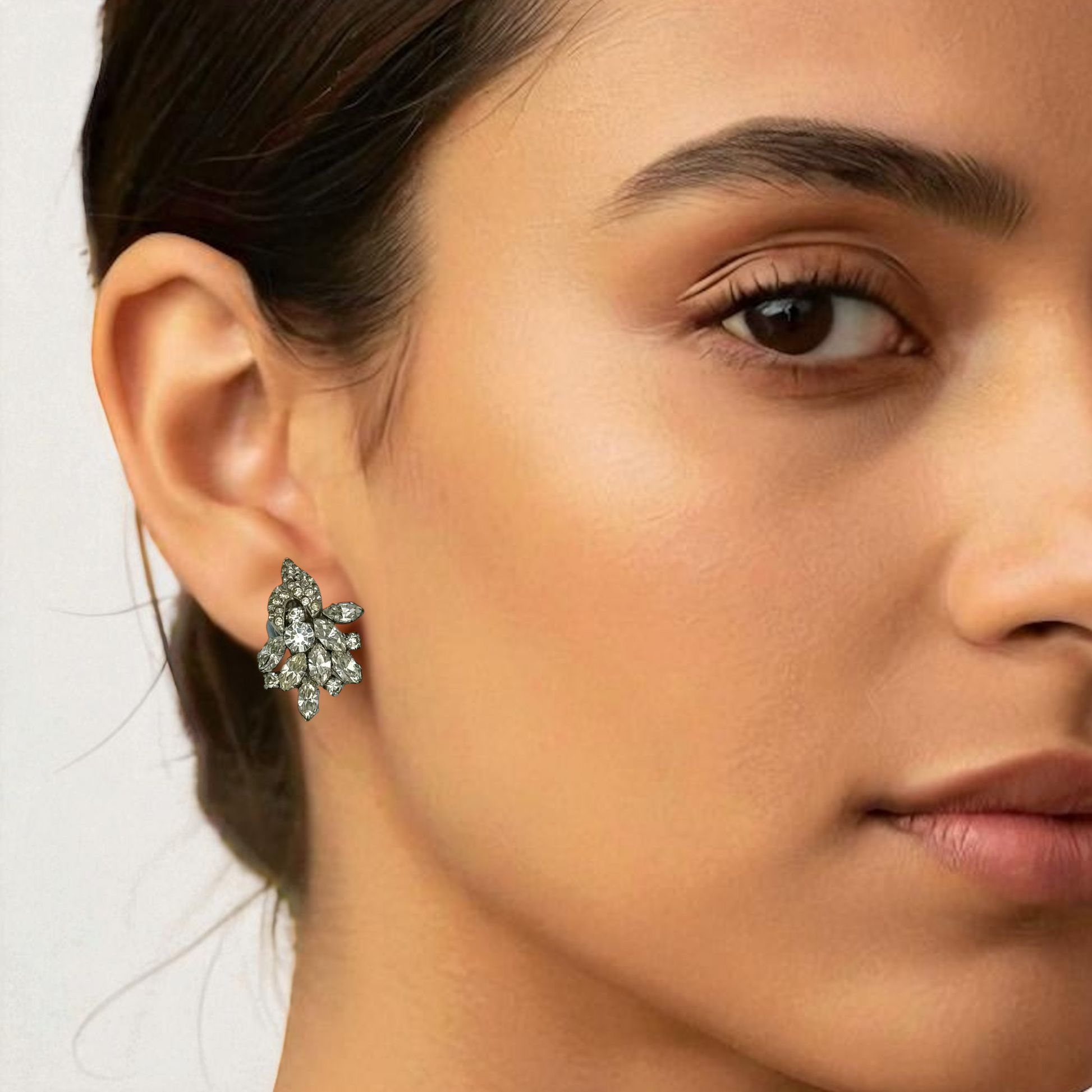 Bu göz kamaştırıcı 1950’lere ait vintage kristal küpeler, sofistike ve zarafet yayan buz beyazı taşlarıyla zamansız bir şıklık sunar. Koleksiyoncular veya gardırobuna vintage bir ışıltı katmak isteyenler için mükemmel bir seçimdir. Çok yüzeyli rhinestone taşlar ışığı büyüleyici bir şekilde yansıtarak, her kombinize zarif bir dokunuş katar.