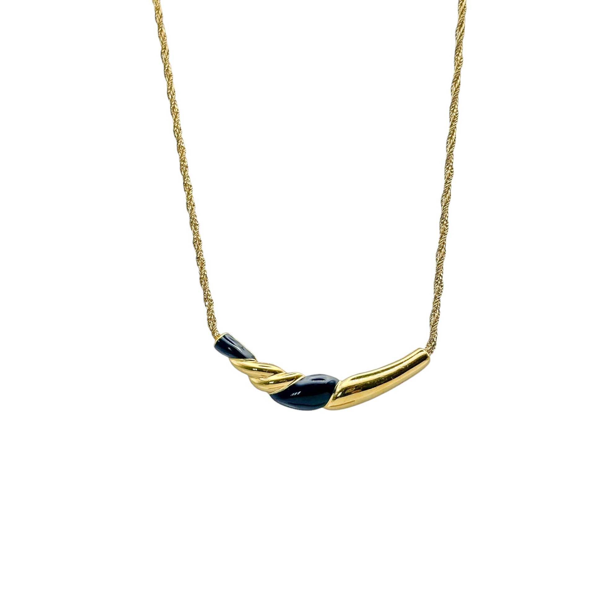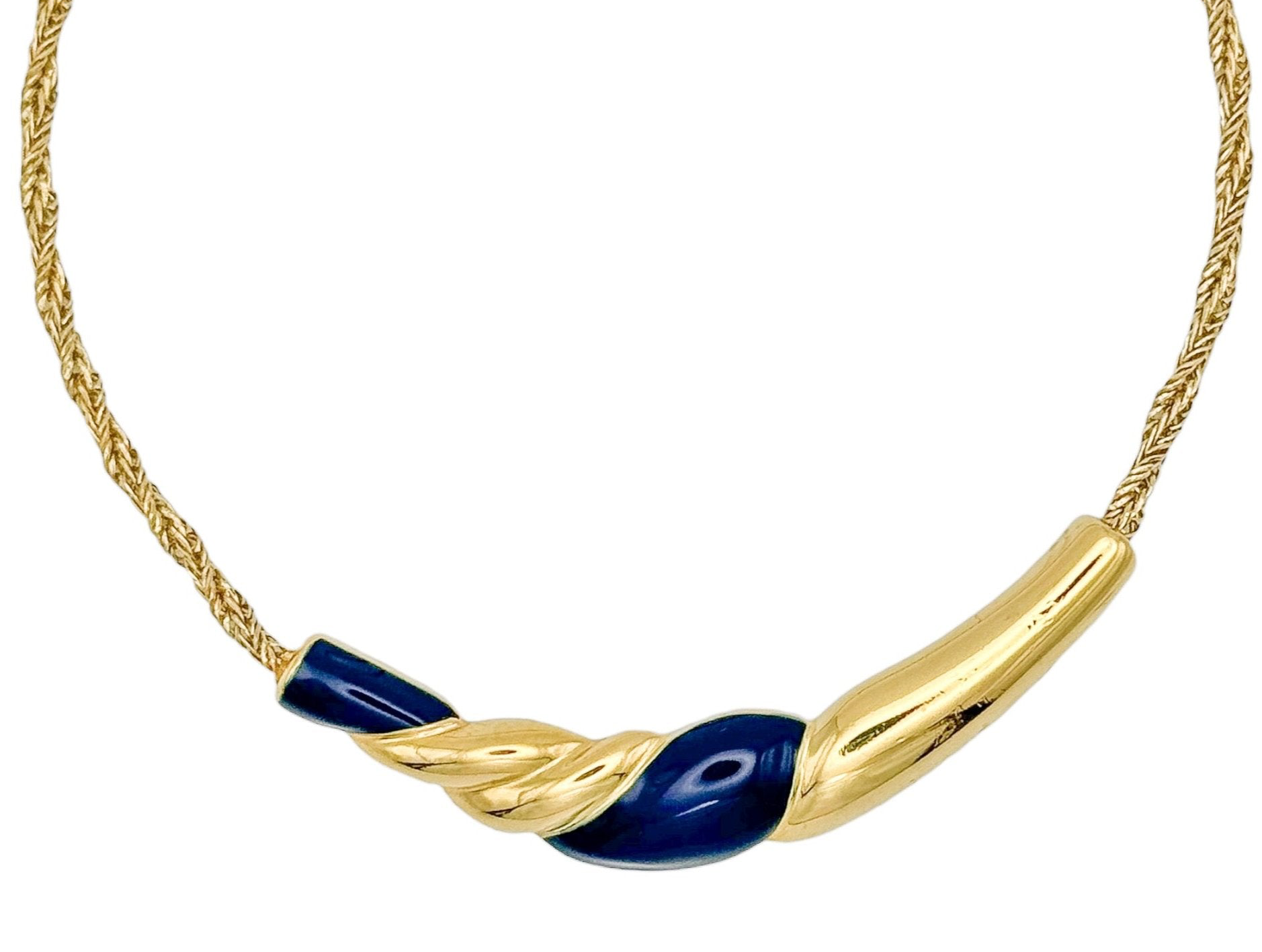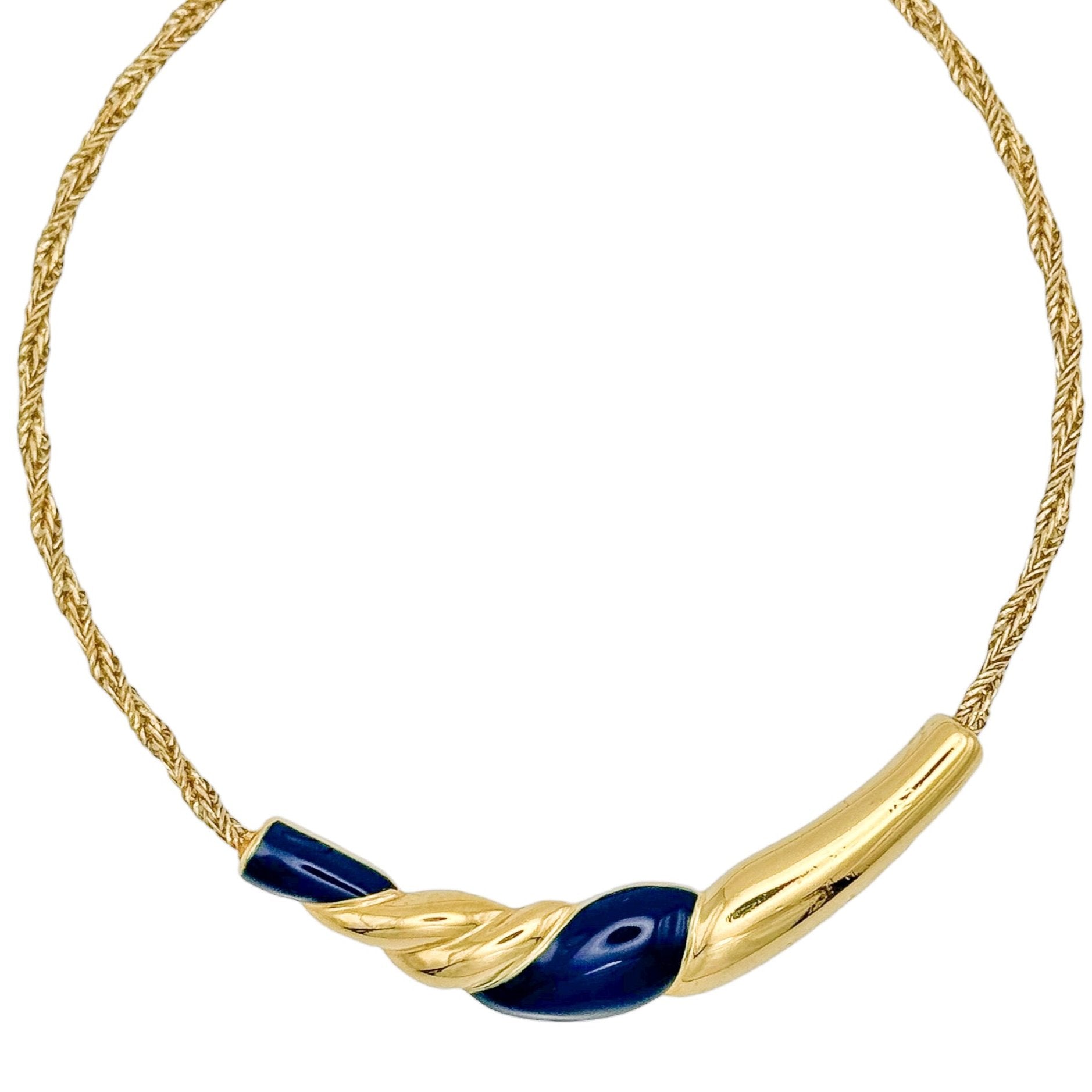 Bu göz alıcı Bergdorf Goodman imzalı vintage kolye, lacivert mine ve altın tonlarının zarif uyumuyla sofistike bir şıklık sunuyor. Cesur tasarımı, markanın karakteristik zarafetini yansıtarak her stile seçkin bir dokunuş katıyor.