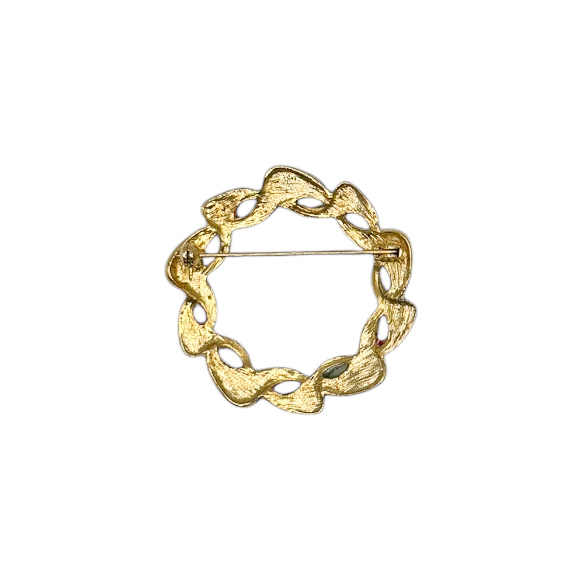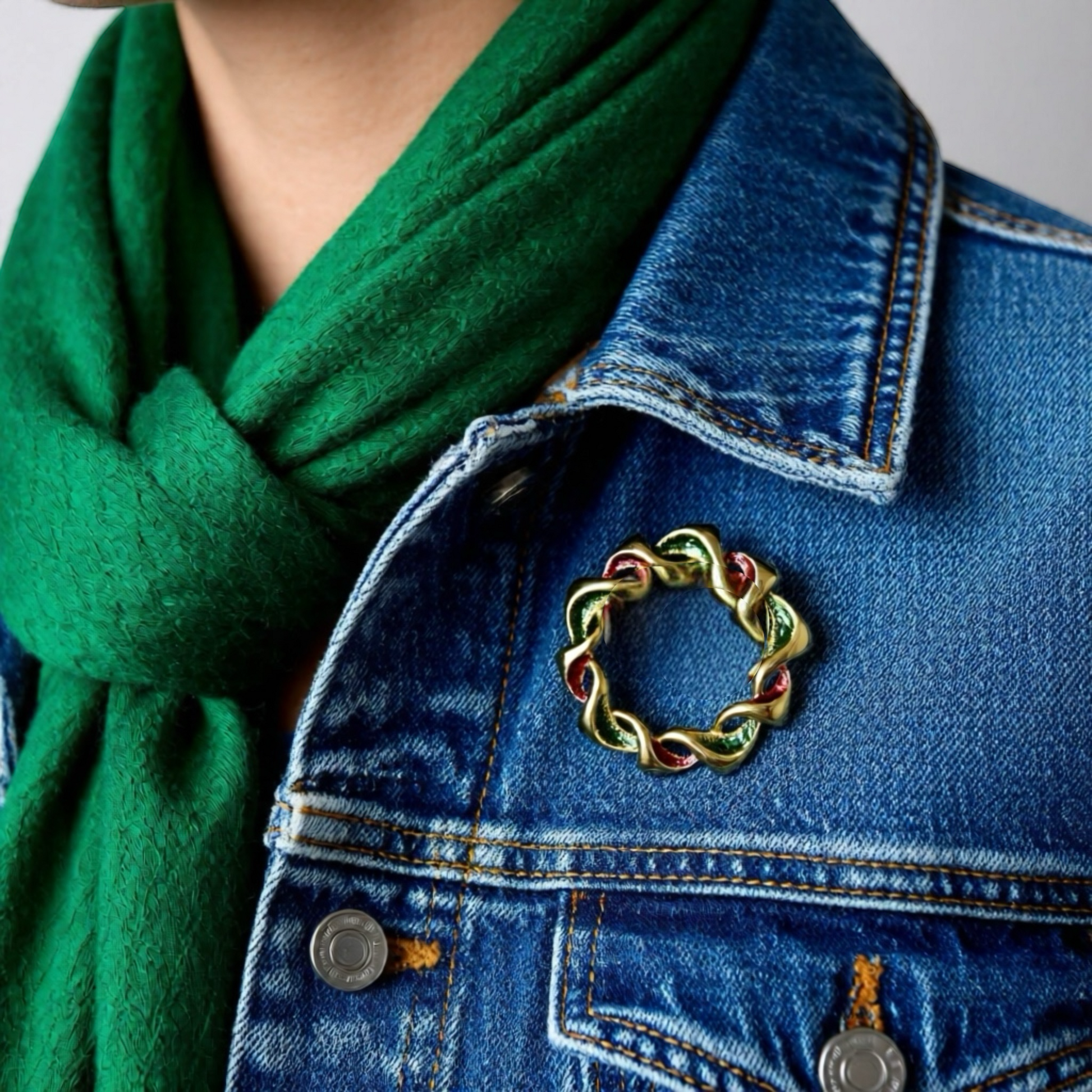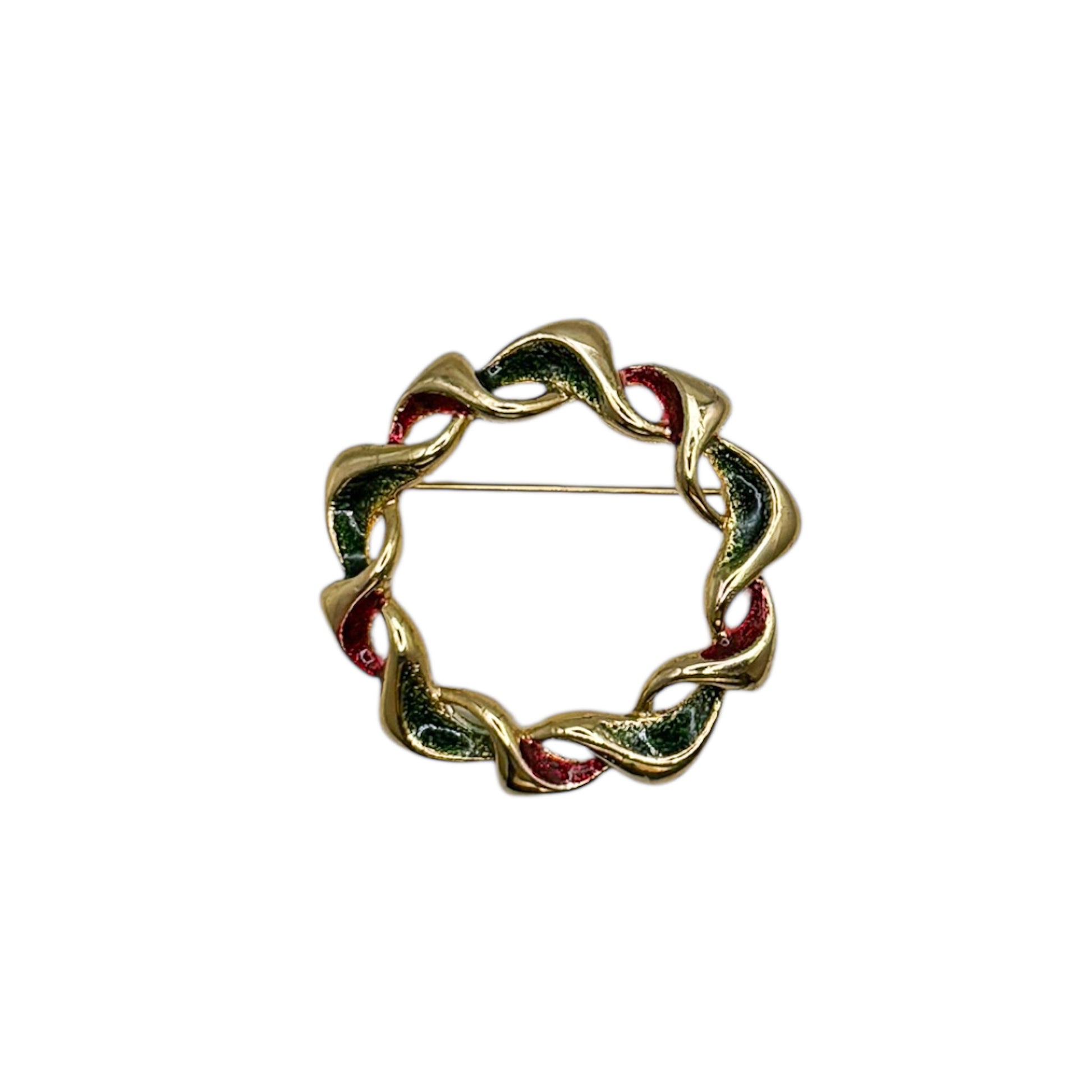 Bu şirin 1980’ler vintage Noel çelengi broş, her tatil kıyafetine zarif bir şıklık katıyor. Altın tonlu metalden üretilmiş ve kırmızı ile yeşil mine işi detaylarla süslenmiş olan burgu şerit tarzı tasarımı, sezonun sıcak ve nostaljik ruhunu yansıtıyor.