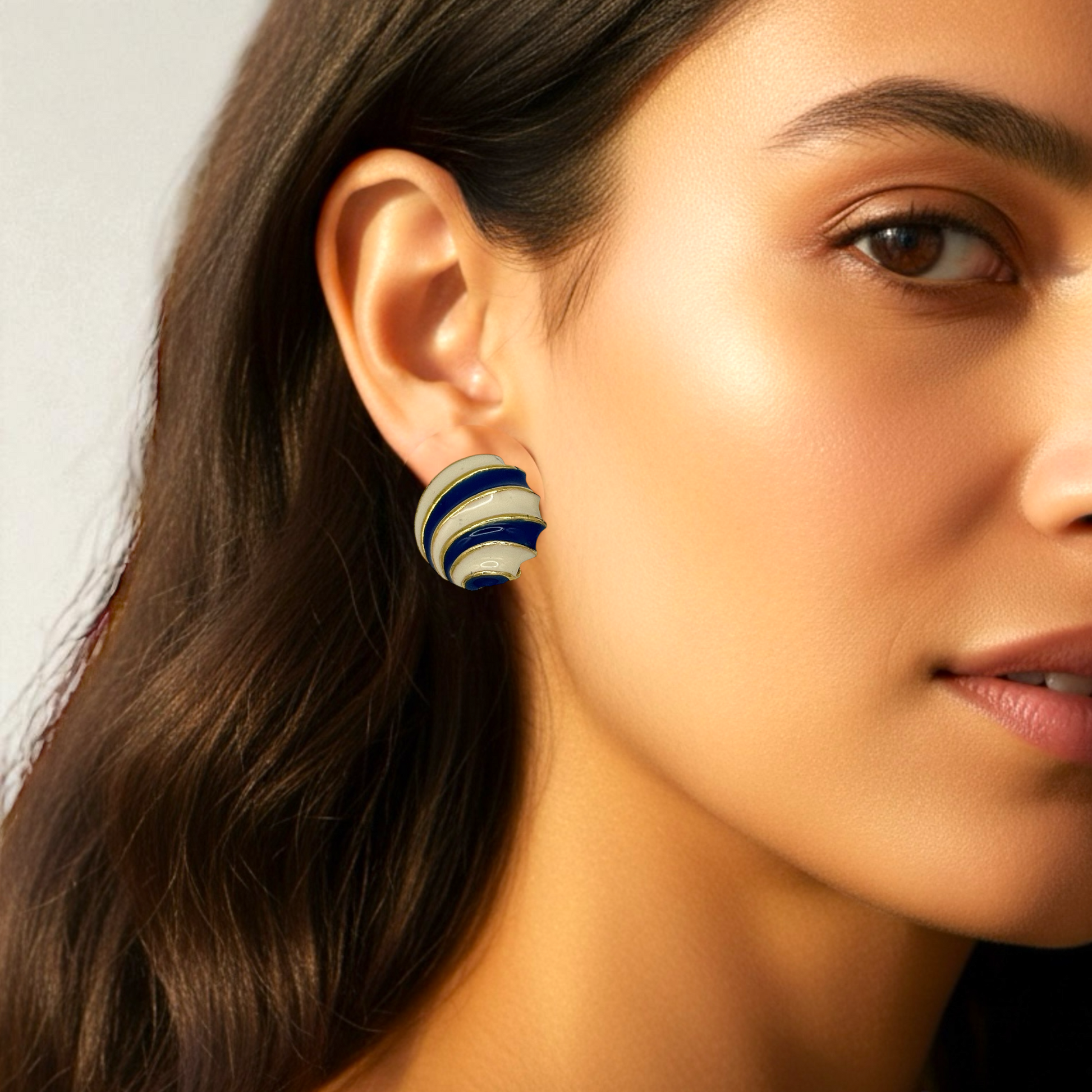 1980'lerde üretilen bu vintage klipsli küpeler, sofistike beyaz ve mavi mine tasarımıyla süslenmiş zamansız bir deniz kabuğu şekline sahiptir. Zarif ve neşeli bir şıklık sunan bu aksesuar, vintage modanın özünü yakalayan çekici bir retro parça olarak öne çıkıyor.