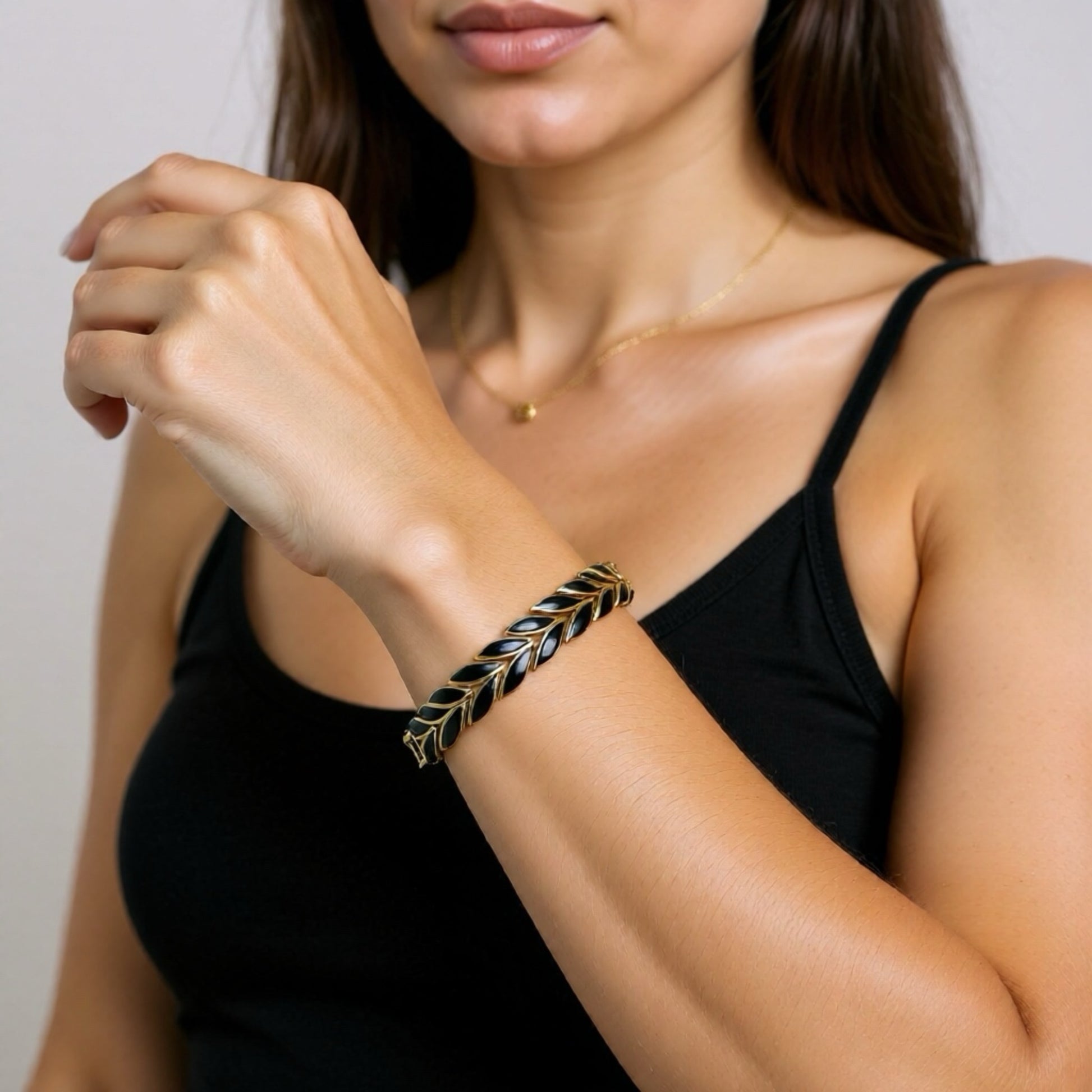 Vintage Altın Kaplama Siyah Mineli Yaprak Motifli Bilezik