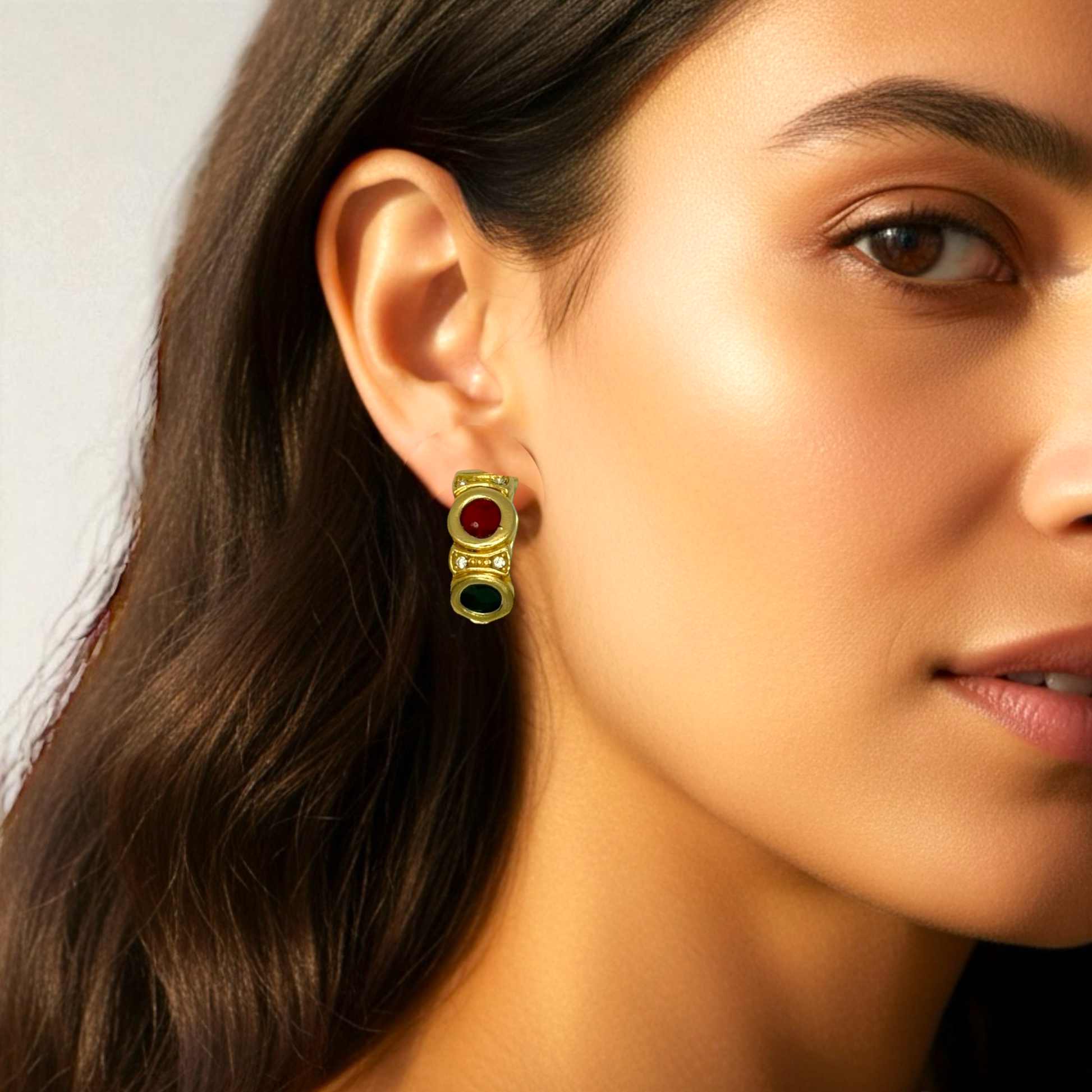 1950’lerde Harlequin markası için tasarlanan bu çarpıcı vintage küpeler, gerçek bir hazine niteliğindedir. Zarif altın kaplama üzerine bordo, kırmızı ve yeşil mine işinin canlı kombinasyonunu sunar ve orta yüzyıl tasarımının neşeli ve enerjik ruhunu yansıtır. Cesur renkleri, zamansız bir ifade parçası olarak öne çıkar.