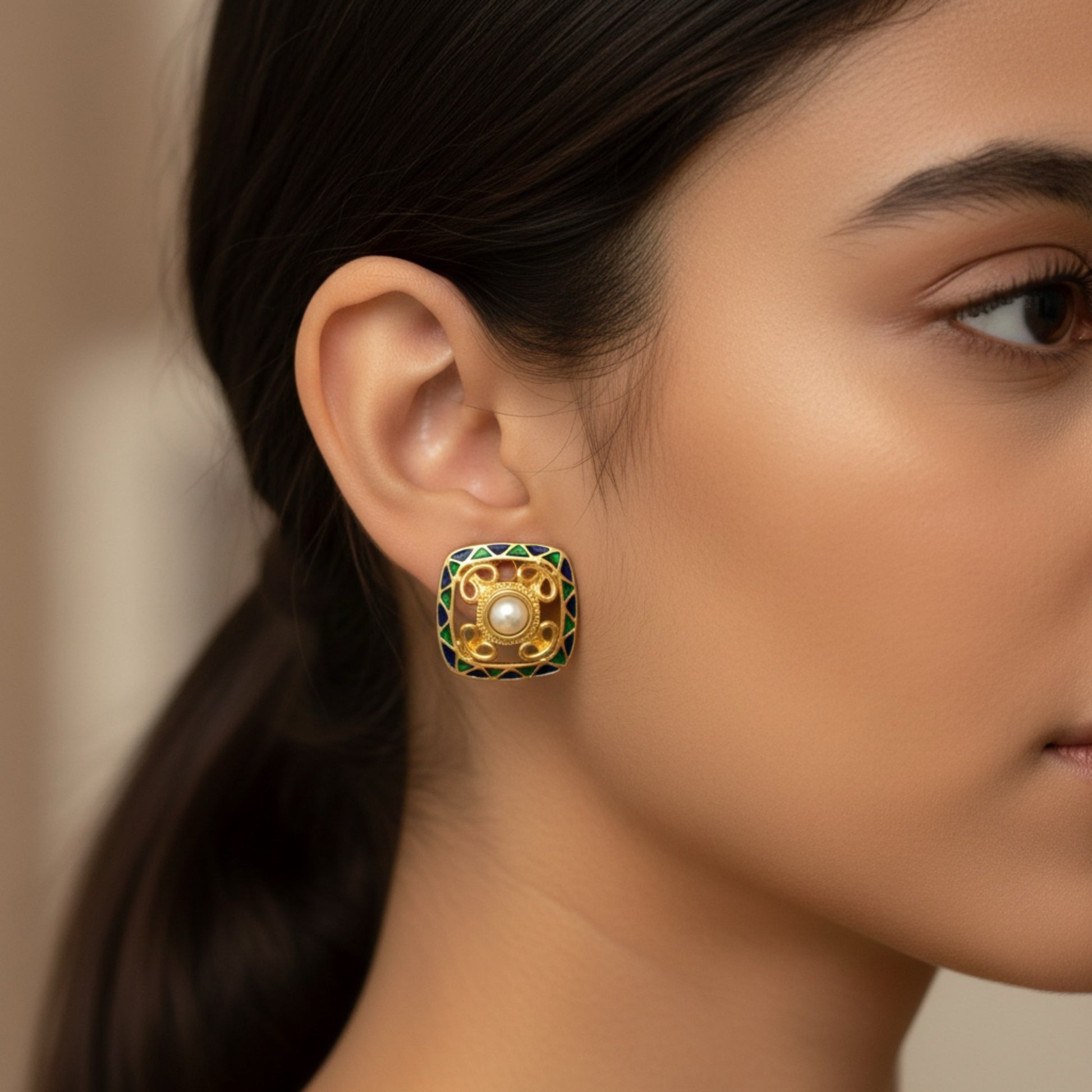 1980’lere ait bu gösterişli vintage küpeler, lacivert ve zümrüt yeşili mine detaylarını imitasyon inci ile birleştirerek cesur ve sofistike bir görünüm sunar. Kare formu ve canlı renk kombinasyonu sayesinde, bu klipsli küpeler her kıyafete vintage bir dokunuş katmak için mükemmel bir parçadır. Zarif ve dikkat çekici tasarımıyla koleksiyonunuzda öne çıkan bir aksesuar olarak yer alır.