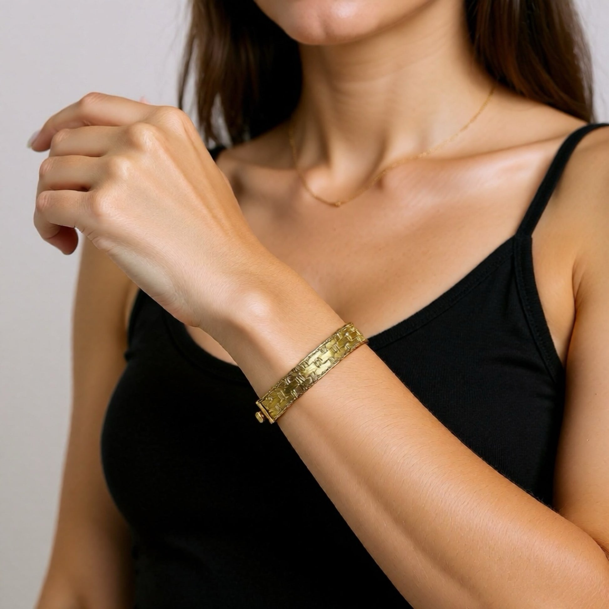 Zarif dokuma örgü tasarımıyla öne çıkan bu bilezik, her kombine lüks bir doku ve sofistike bir şıklık katıyor. Altın kaplaması klasik zarafeti vurgularken, güvenlik zinciri hem ekstra güvenlik sağlar hem de vintage bir dokunuş ekler. Hiç kullanılmamış ve kusursuz durumda olan bu bilezik, retro modanın estetiğini modern bir dokunuşla keşfetmeyi sevenler için benzersiz bir parçadır.
