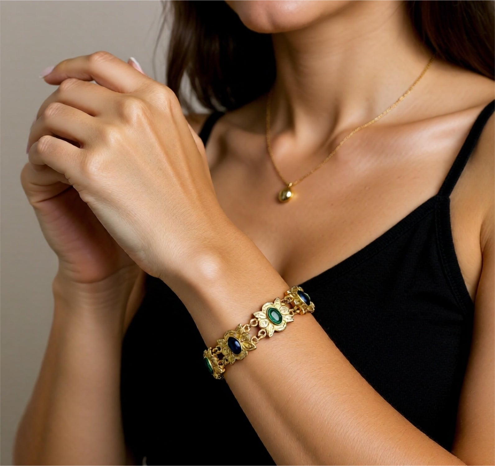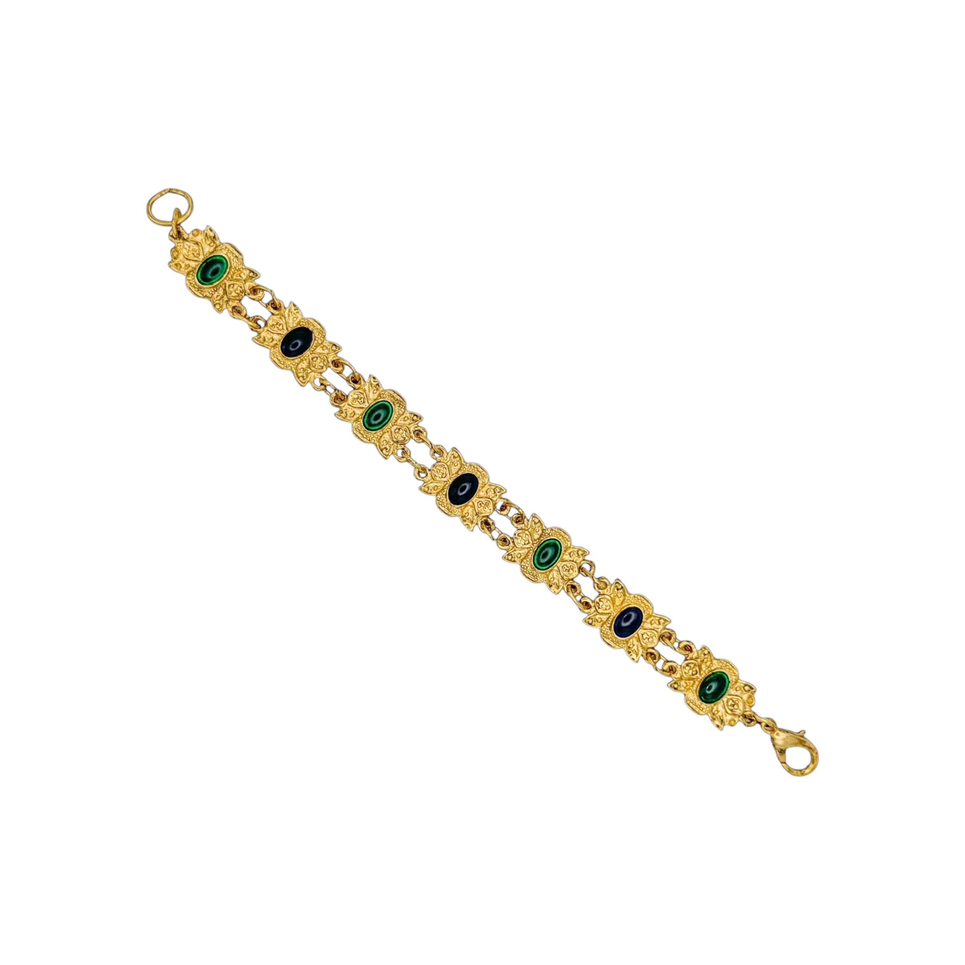 Vintage Altın Kaplama Lacivert ve Zümrüt Yeşili Mineli Bilezik