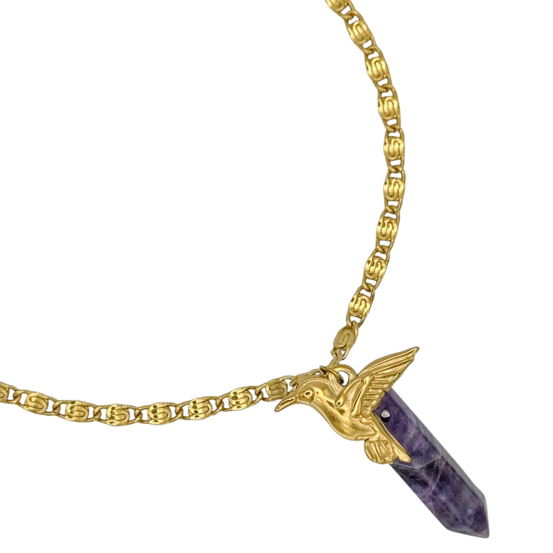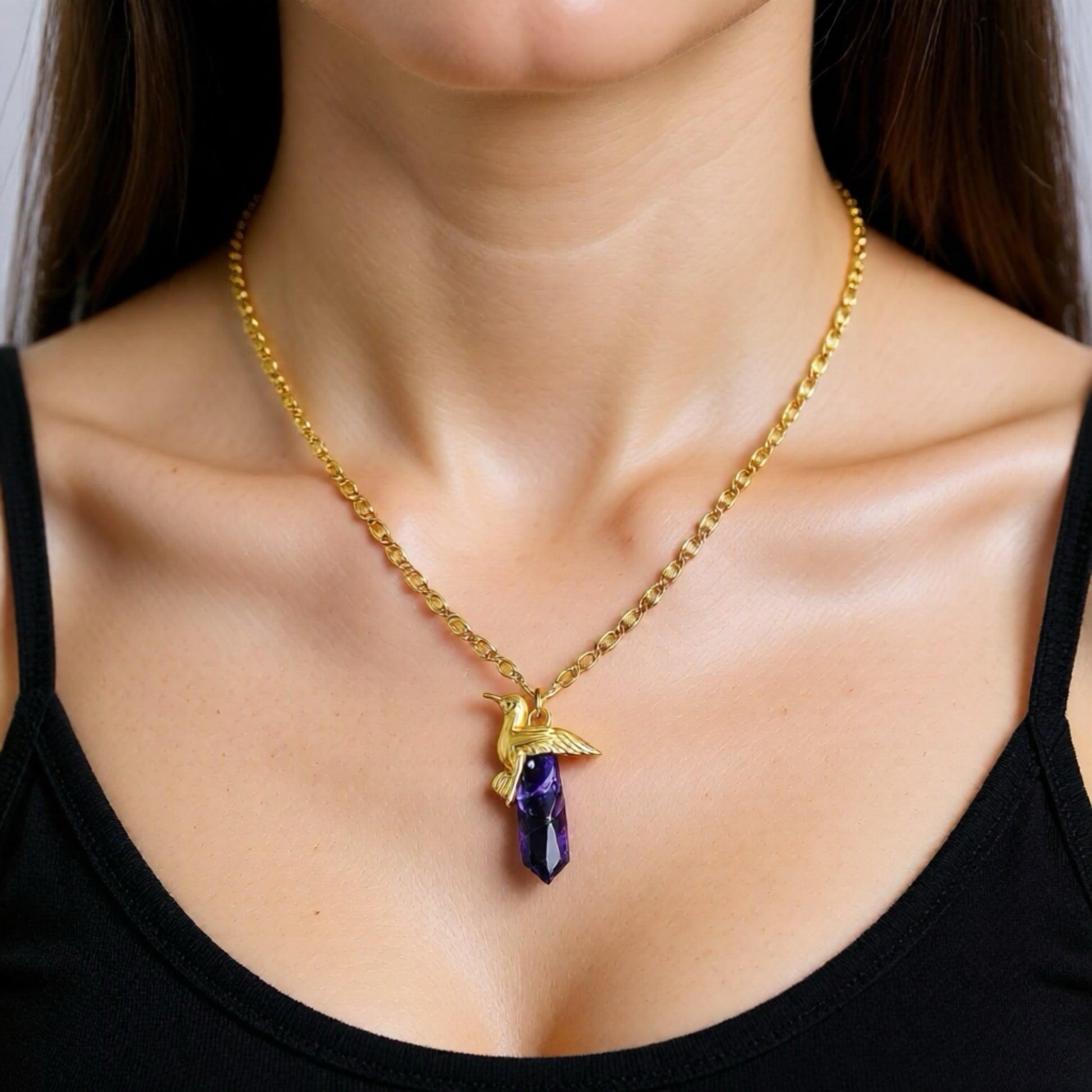 - Tasarım: Modern doğal ametist taşlı kuş kolye ucu ile salyangoz zincir