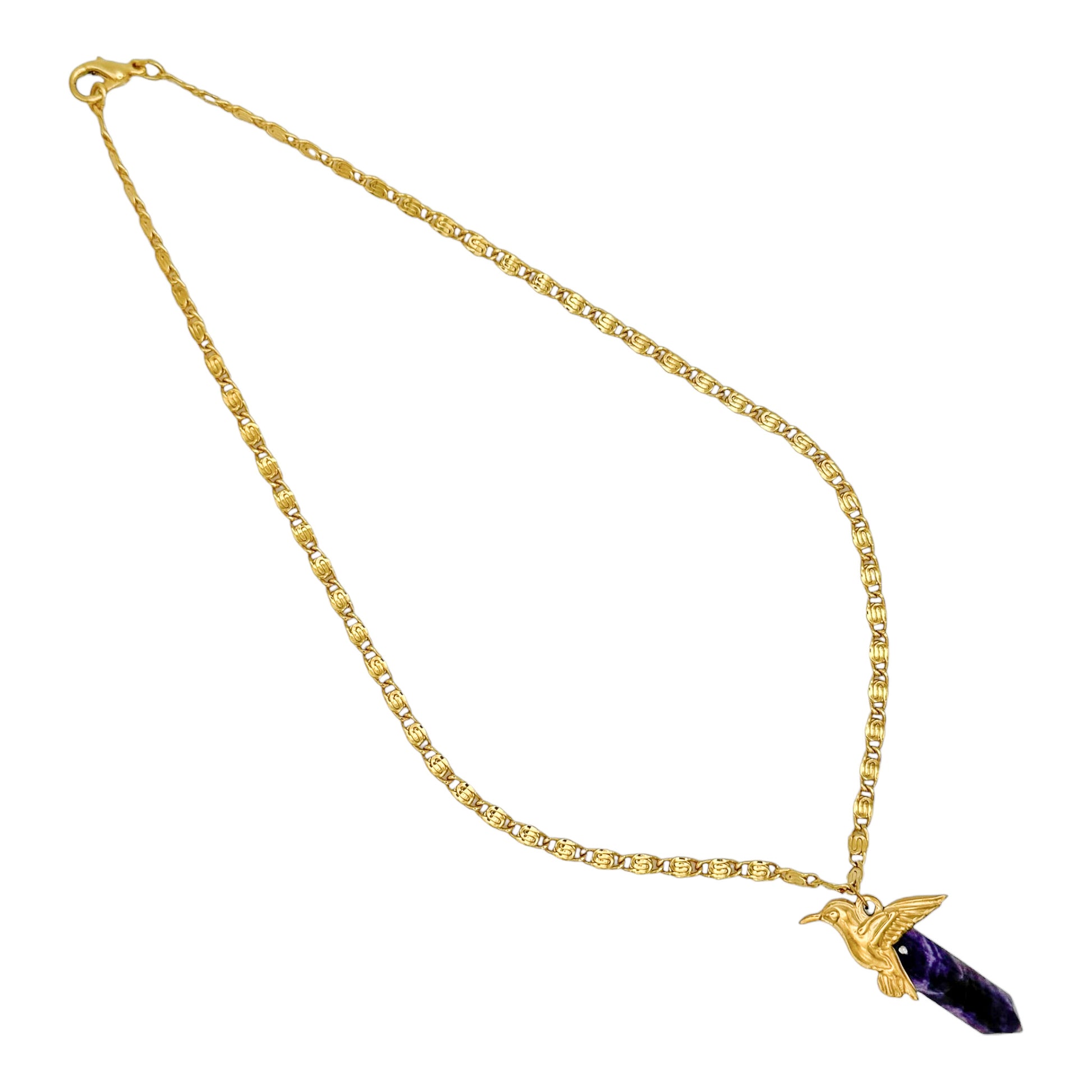 Vintage zarafeti modern lüks ile birleştiren bu sofistike kolye, 1980’lerden altın kaplama salyangoz zincir ile yeniden tasarlanmış, doğal ametist taşlı altın kuş kolye ucu ile tamamlanmıştır. Klasik salyangoz zincir, zamansız bir şıklık sunarken, ametist taşlı kuş detayı canlı ve modern bir dokunuş katıyor. Koleksiyoncular ve anlamlı, iddialı bir parça arayanlar için ideal olan bu kolye, geçmişin zarafetini doğal taşların enerjisiyle harmanlıyor.