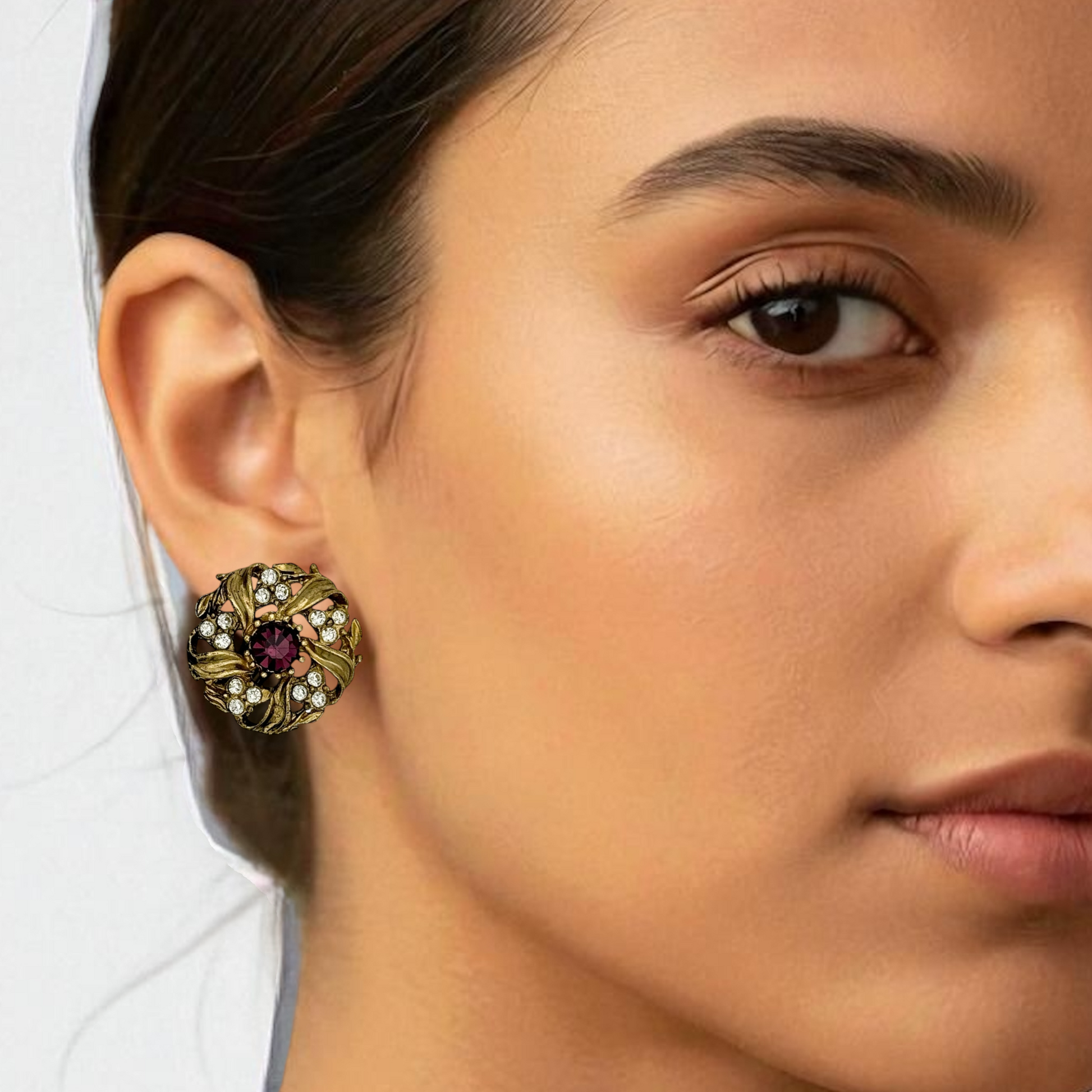Vintage Altın Tonlu İmitasyon Elmas ve Ametist Cam Detaylı Küpe