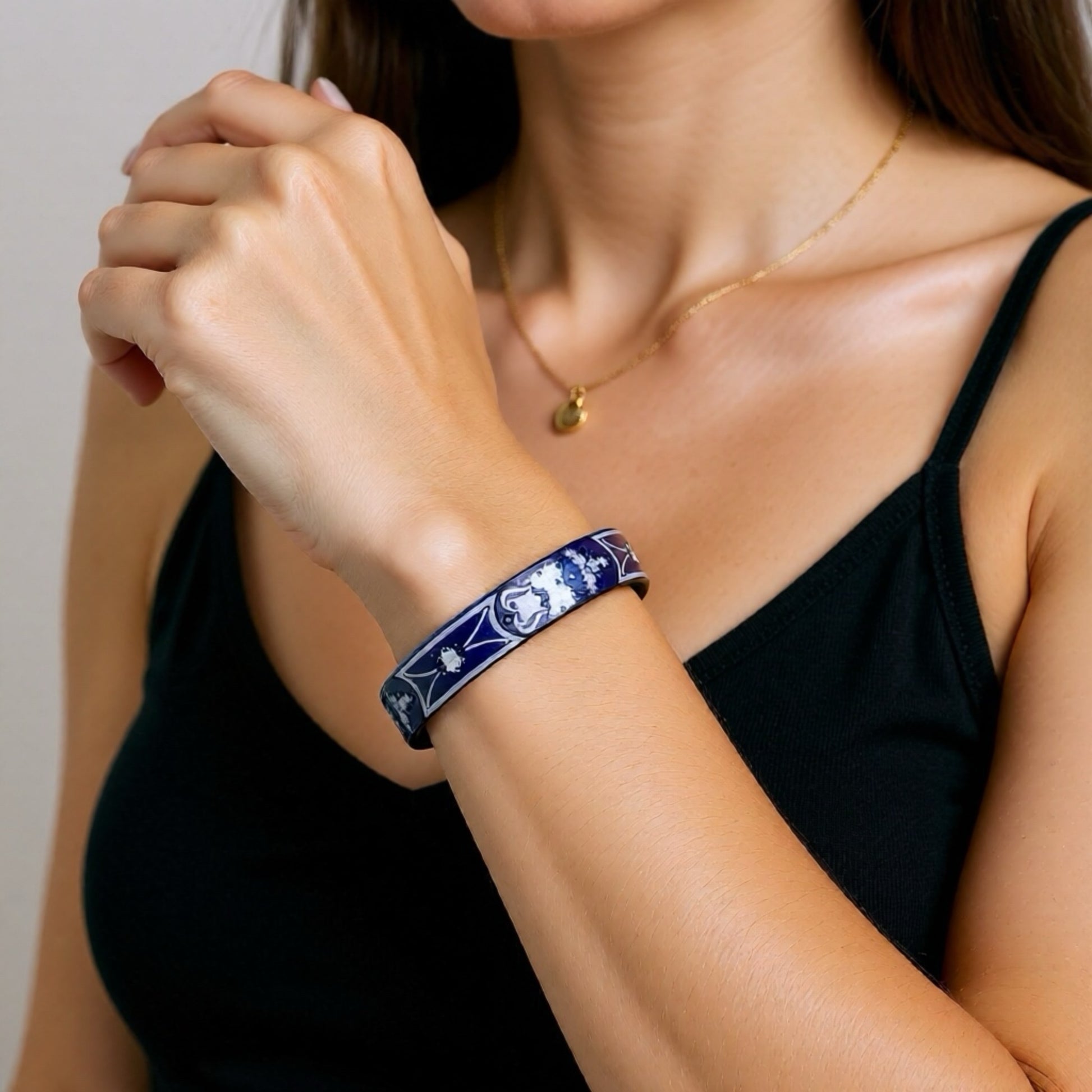 Koleksiyonunuza sofistike bir dokunuş katın: Bu vintage Michaela Frey mine işi bilezik, Avusturya zanaatkarlığının güzelliğini mor, lila ve beyaz mine detaylarıyla zarif bir şekilde sergiliyor. Üstün kalitedeki mine işçiliğiyle tanınan Michaela Frey, sanatı ve sofistikeliği harmanlayan zamansız bir aksesuar yaratmıştır. Koleksiyon meraklıları ve rafine vintage takılara değer verenler için mükemmel bir parçadır.