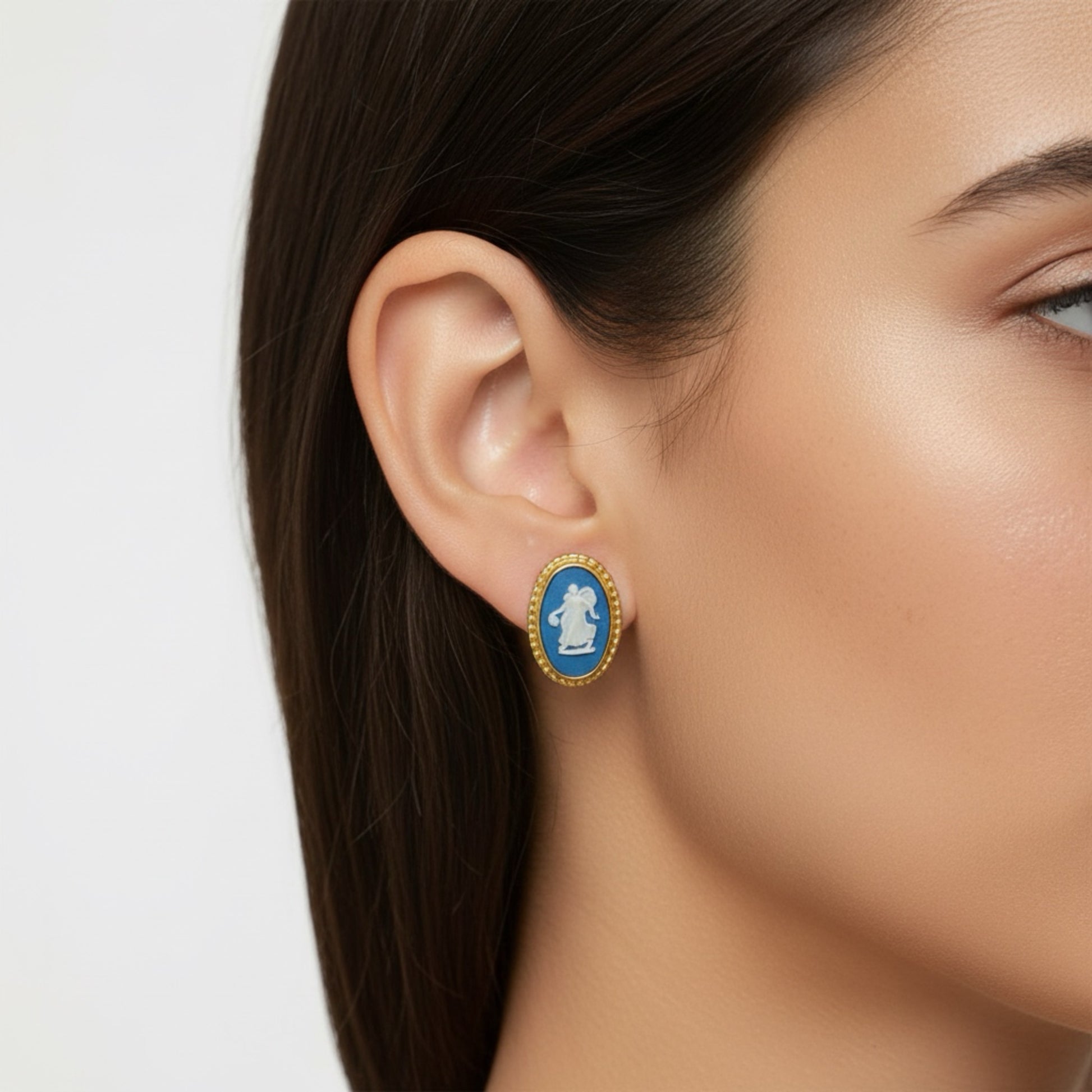 Vintage Wedgwood Mavi ve Beyaz Cameo Küpe