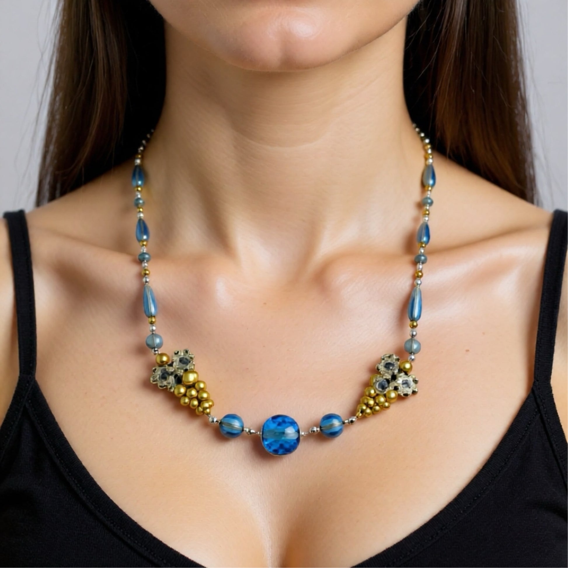 Nadir bulunan bu Viktorya dönemi antika kolye, mavi cam ve imitasyon incilerden oluşan zarif üzüm salkımı tasarımıyla geçmişin şıklığını bugüne taşıyor. Gümüş tonunda telkari yapraklarla süslenmiş, özenle üretilmiş bu vintage kolye, hem koleksiyonluk bir parça hem de her kombine sofistike bir dokunuş katıyor. Viktorya tarzı detayları ve nadir mavi cam malzemesiyle benzersiz bir güzellik sunar.